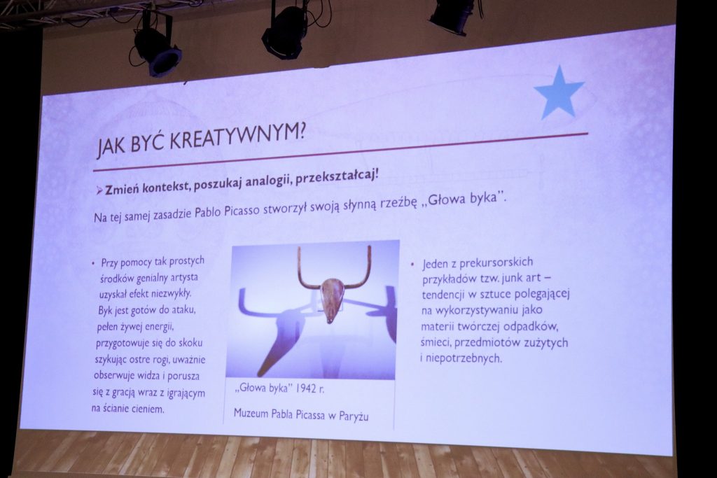 Podczas trzygodzinnej pracy uczniowie mieli możliwość rozbudzić swoją kreatywność oraz zapoznać się z różnymi technikami twórczego myślenia. Warsztaty obejmowały twórcze pisanie, rozwiązywanie zagadek logicznych, wykorzystanie różnego rodzaju transformacji, ćwiczenia wykorzystujące wizualizację, myślenie abstrakcyjne, interpretację dzieła malarskiego oraz przygotowanie etiud teatralnych, których tematem były relacje międzyludzkie. Uczestnicy wspólnie zastanawiali się nad ważnością innowacyjności oraz poznali różne techniki twórczego podejścia do zadań. Najwięcej zabawy zapewniły działania teatralne, które pozwoliły na kreatywne i samodzielne wyreżyserowanie etiud i występ na scenie.